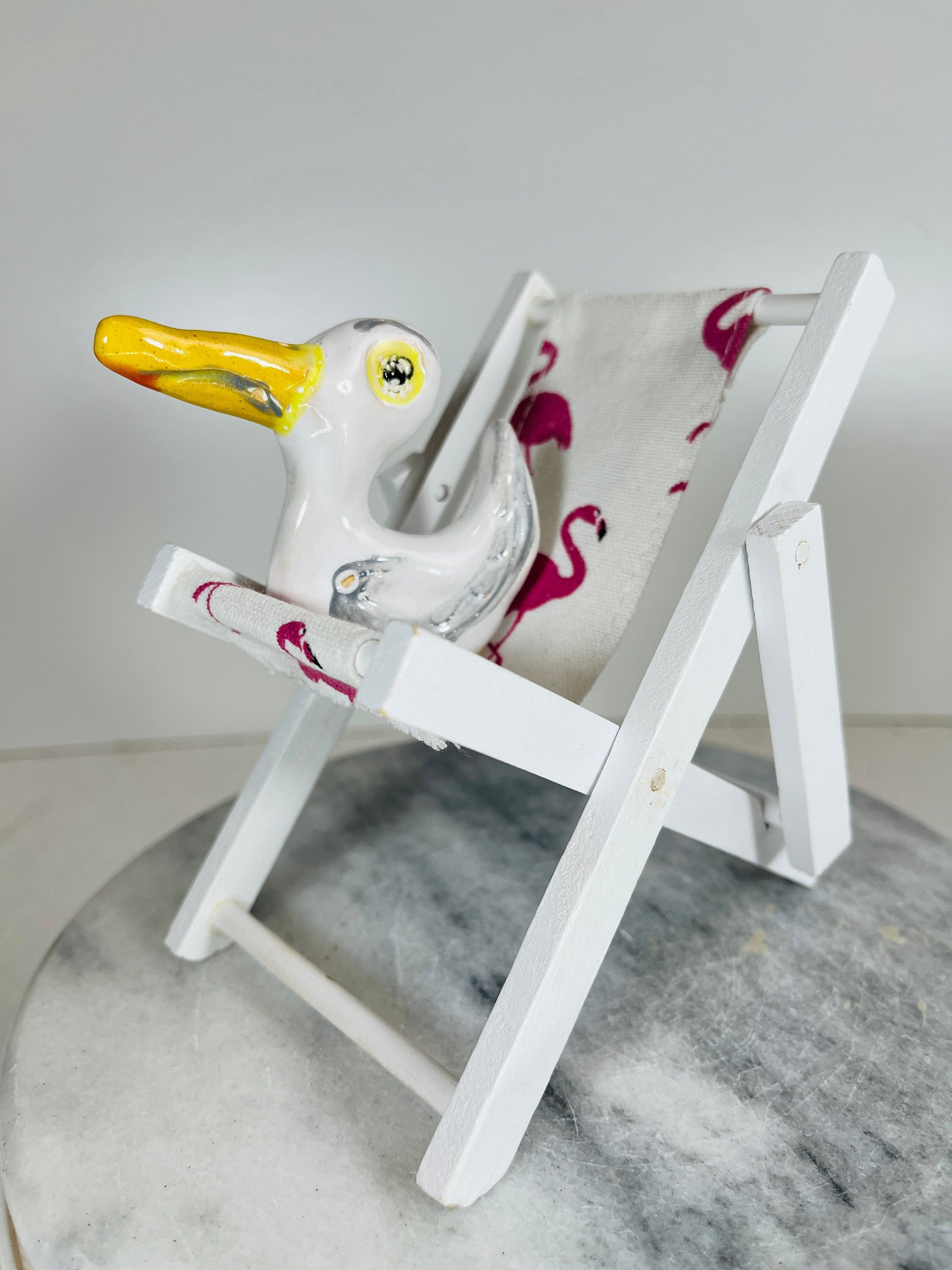 This listing is for one lovely ceramic seagull sitting on his white and pink flamingo deckchair.