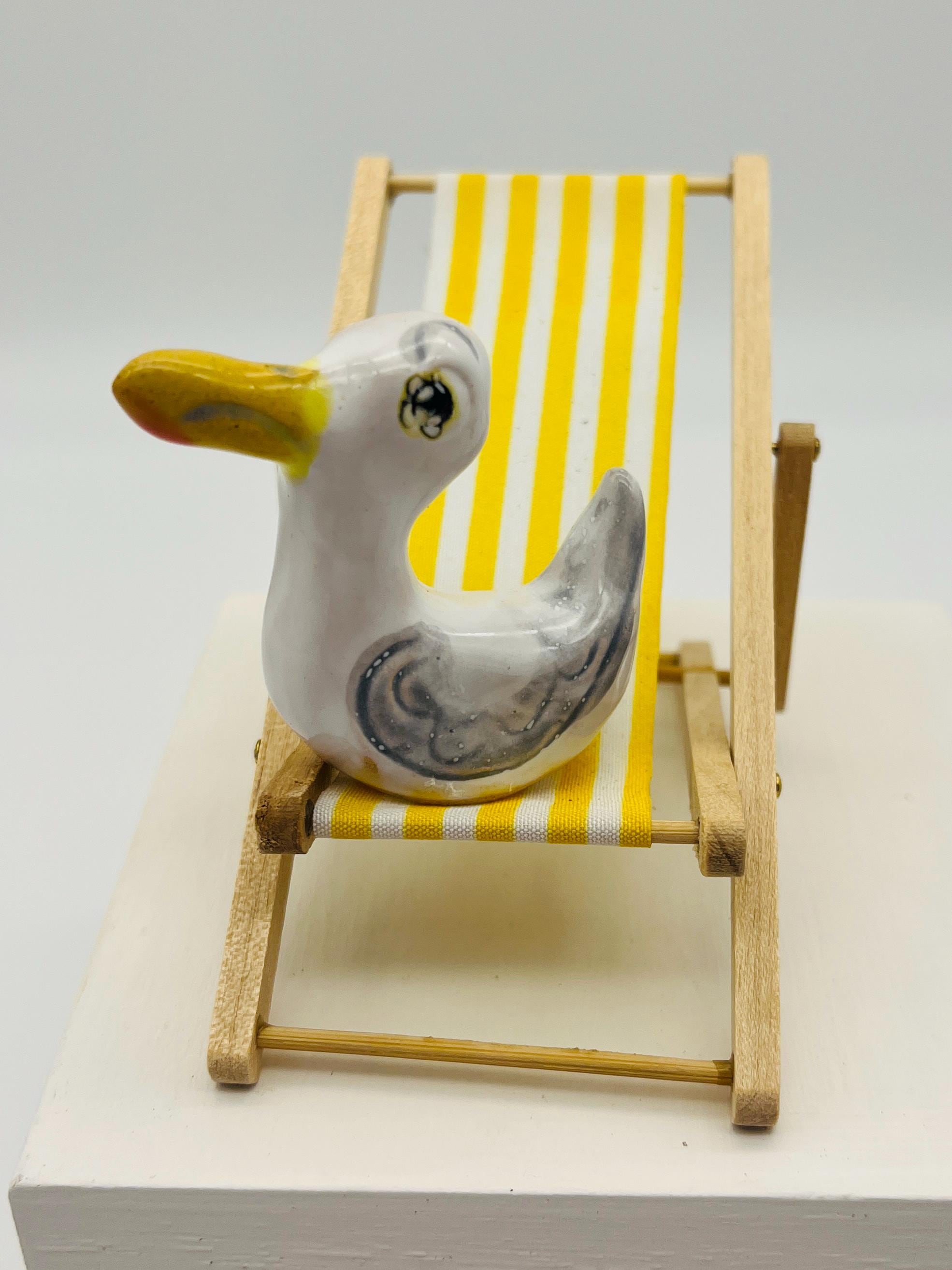 Seagull Pottery Ornament on his Yellow Deckchair, Quirky Fun Bird, Funny Birds on Miniature Deckchairs, Kiln Fired Clay, Sussex Ceramics UK.