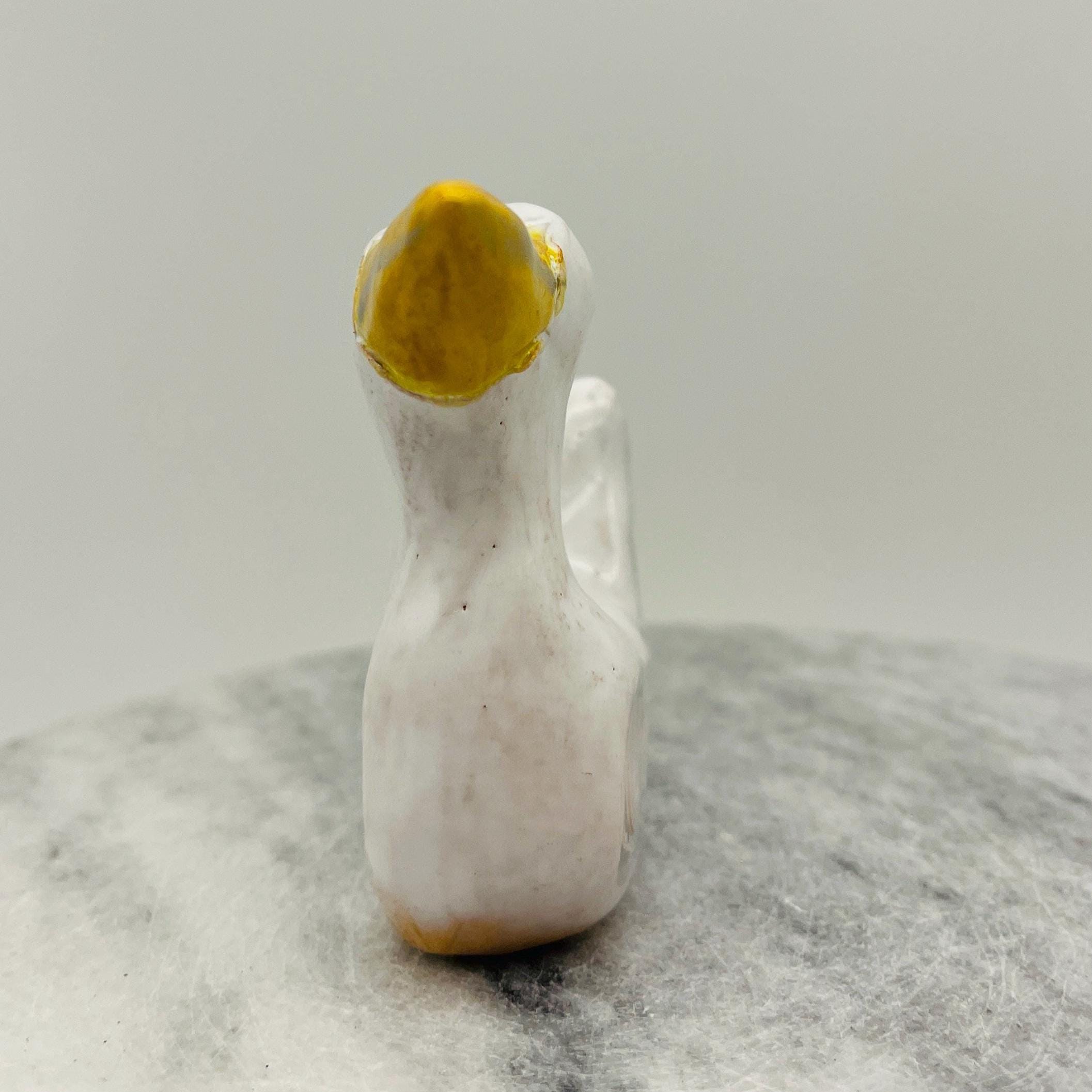 This little fun gull has been hand sculpted in my Sussex pottery. Fired once and then hand painted with glazes with a bright yellow beak. Then fired again fo this glaze firing in my kiln called 'Bertha'.