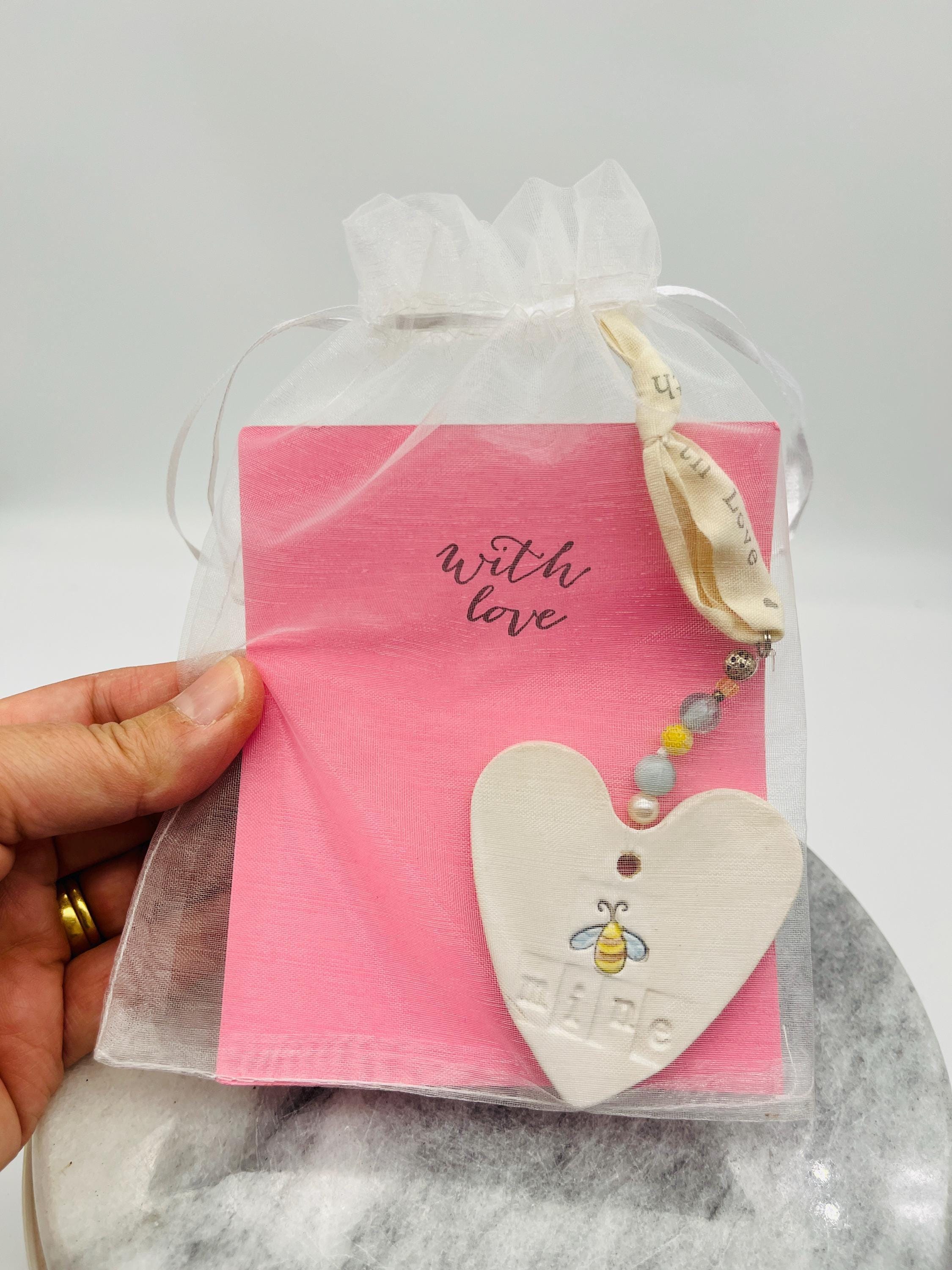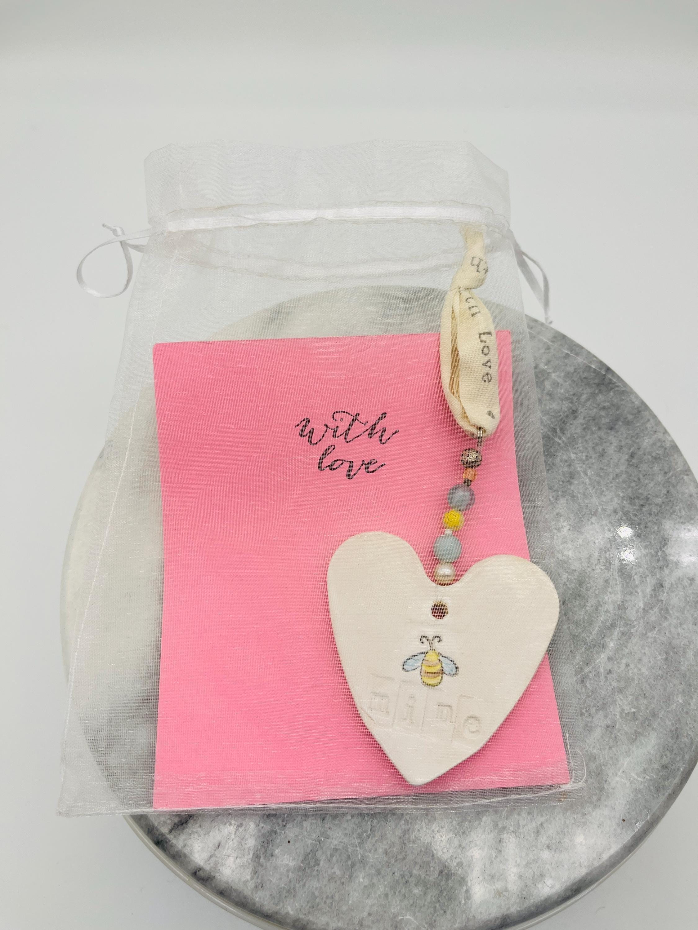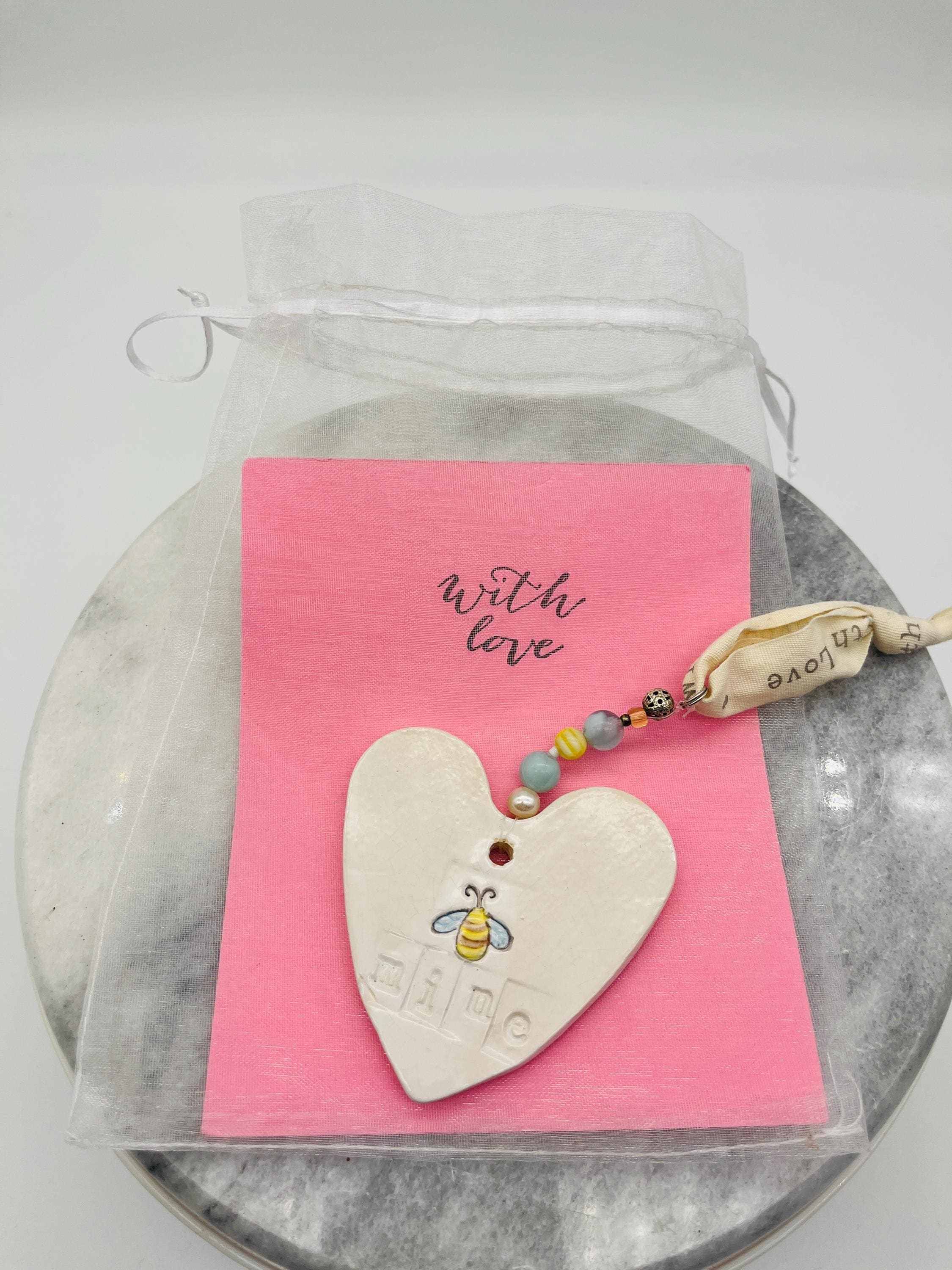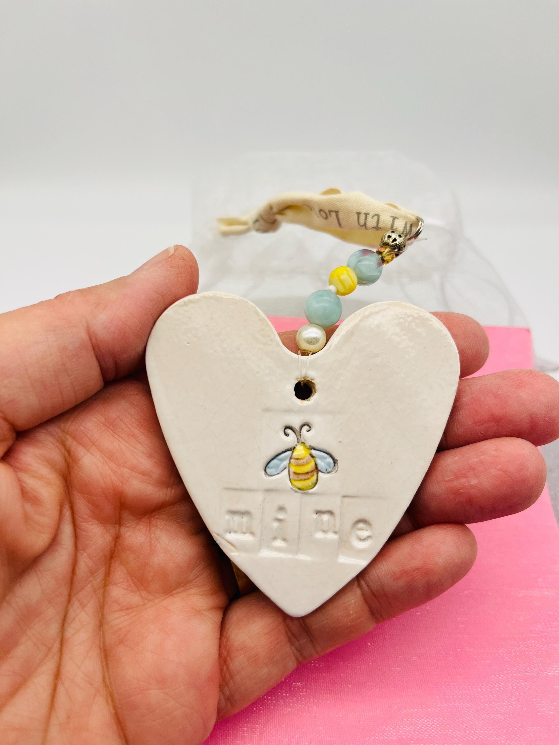 Bee Mine Heart Ornament, Pottery Decor, Handmade Ceramic Home Decoration Ornaments, Made With Clay and Fired In My Kiln.