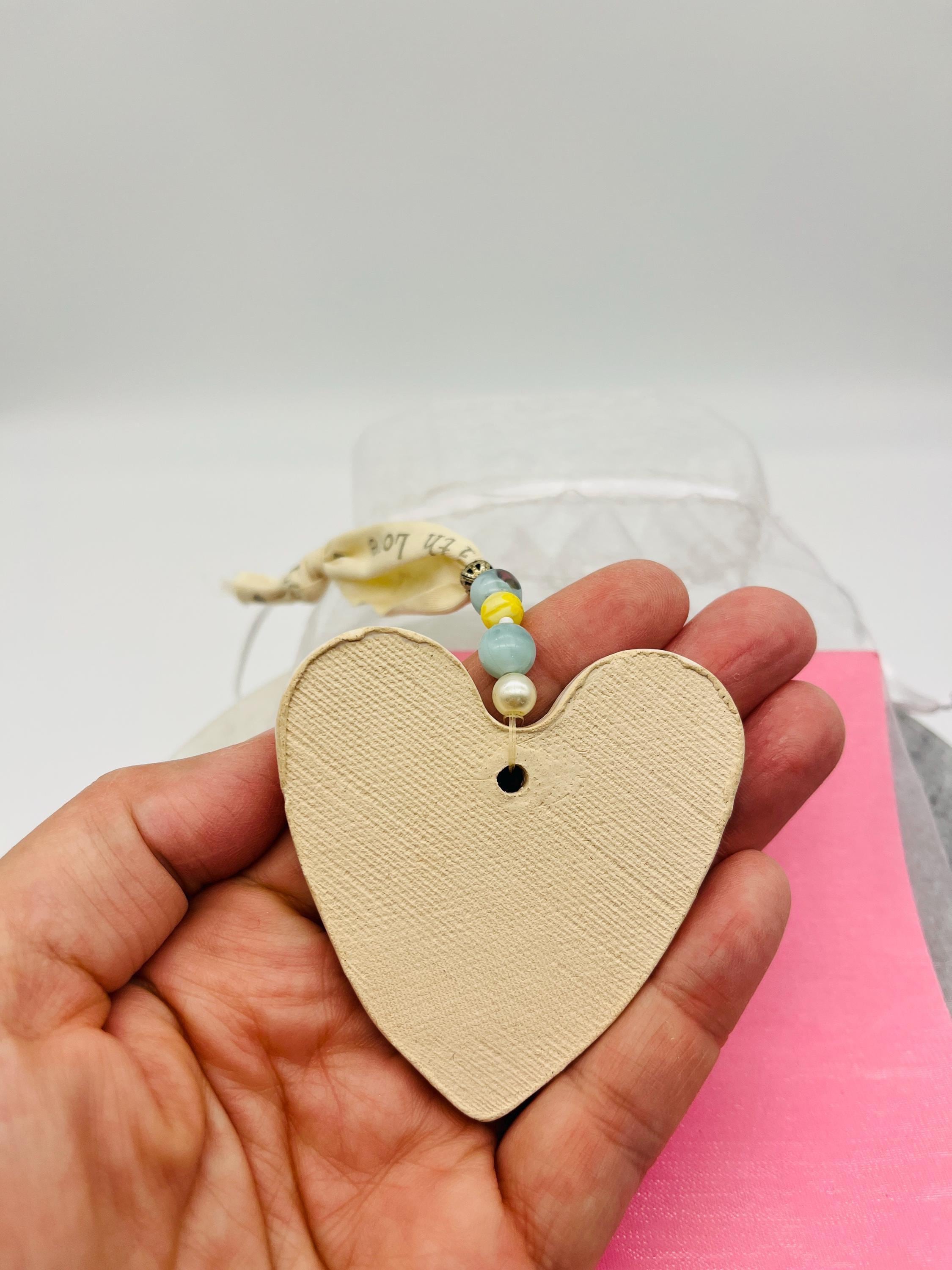 All of my pieces are made individually. The clay was rolled out first then cut and shaped. Next it was dried out and then fired. Glaze was then added and it was fired again. Finally its beads and ribbon were added to give it that extra sparkle.
