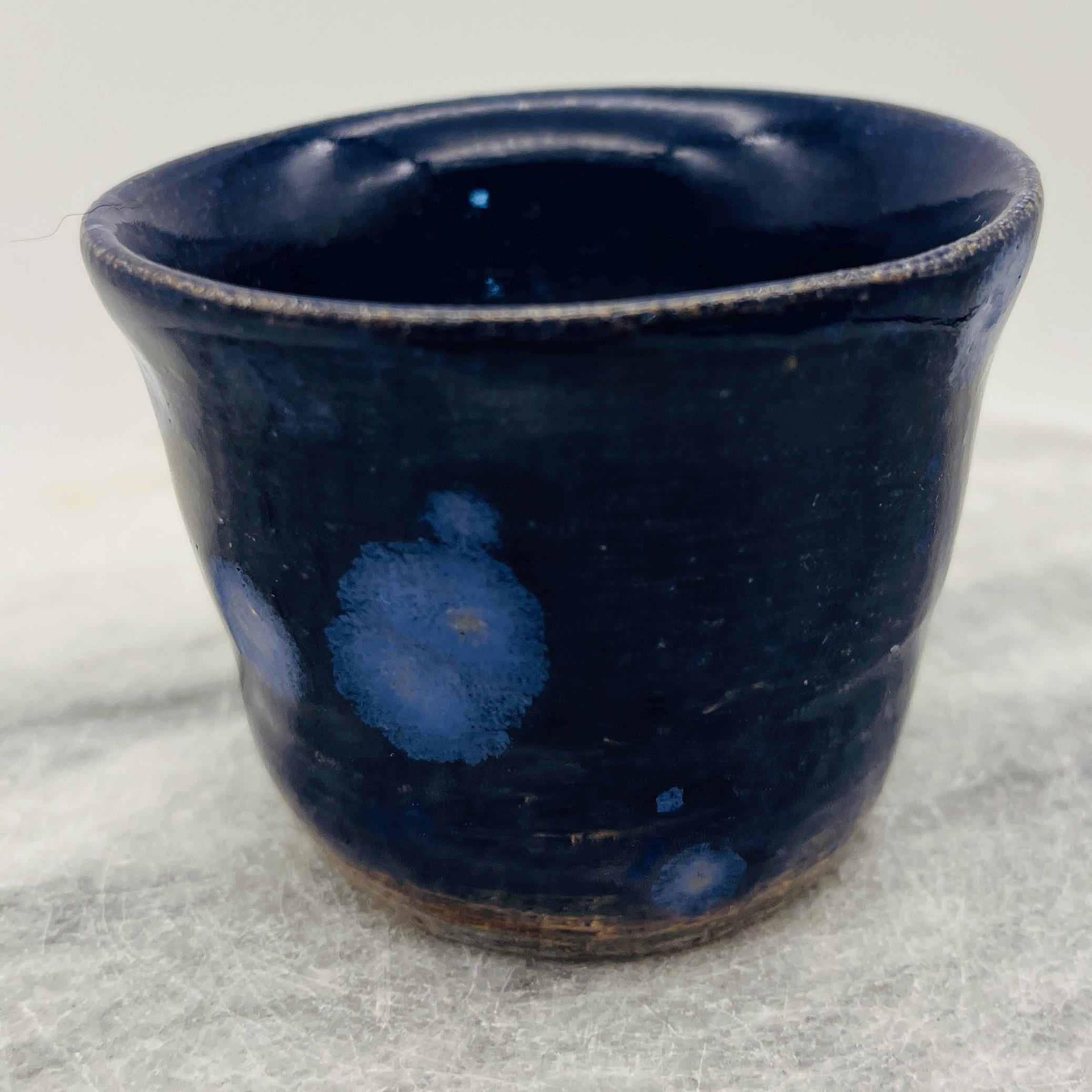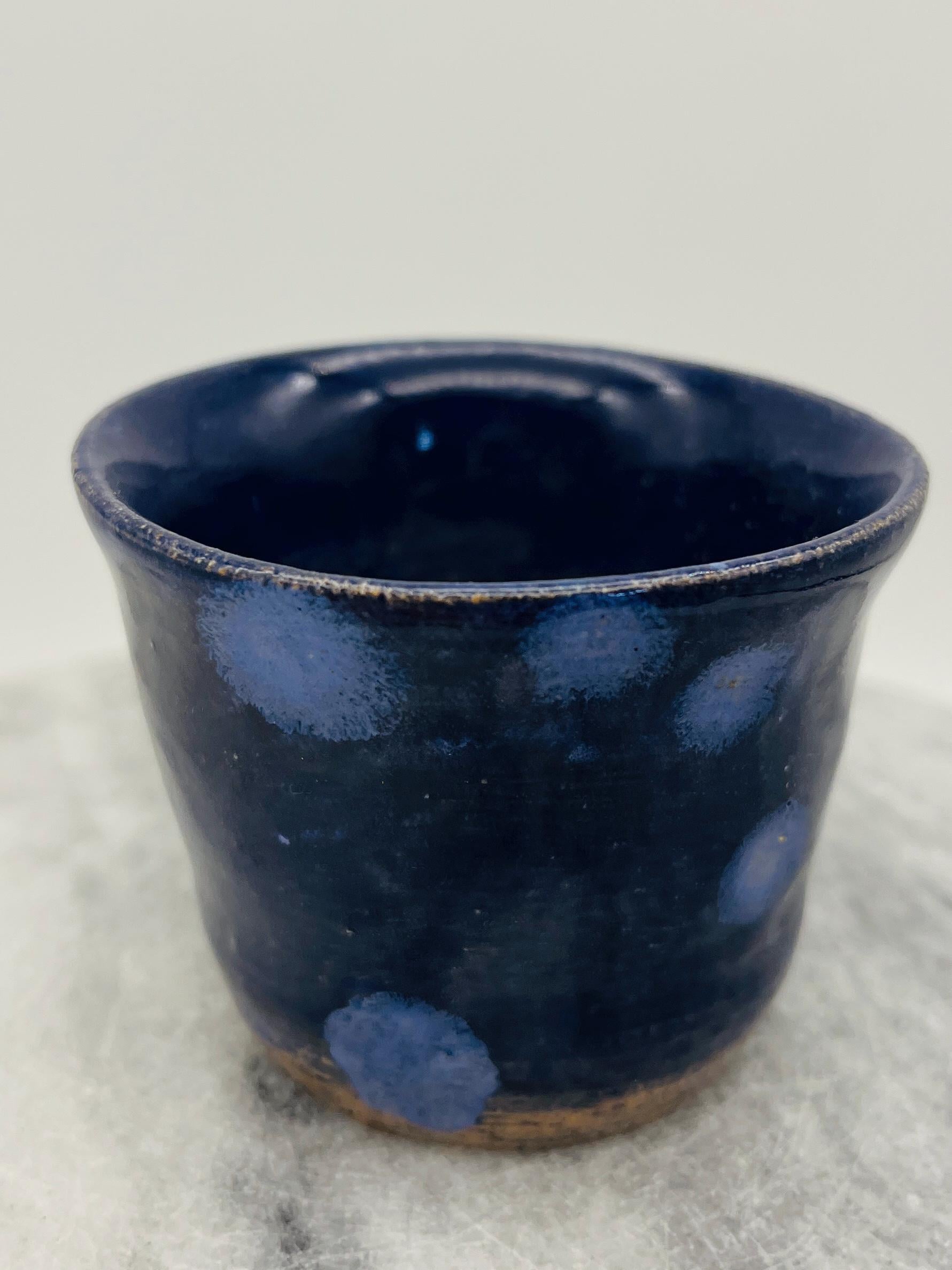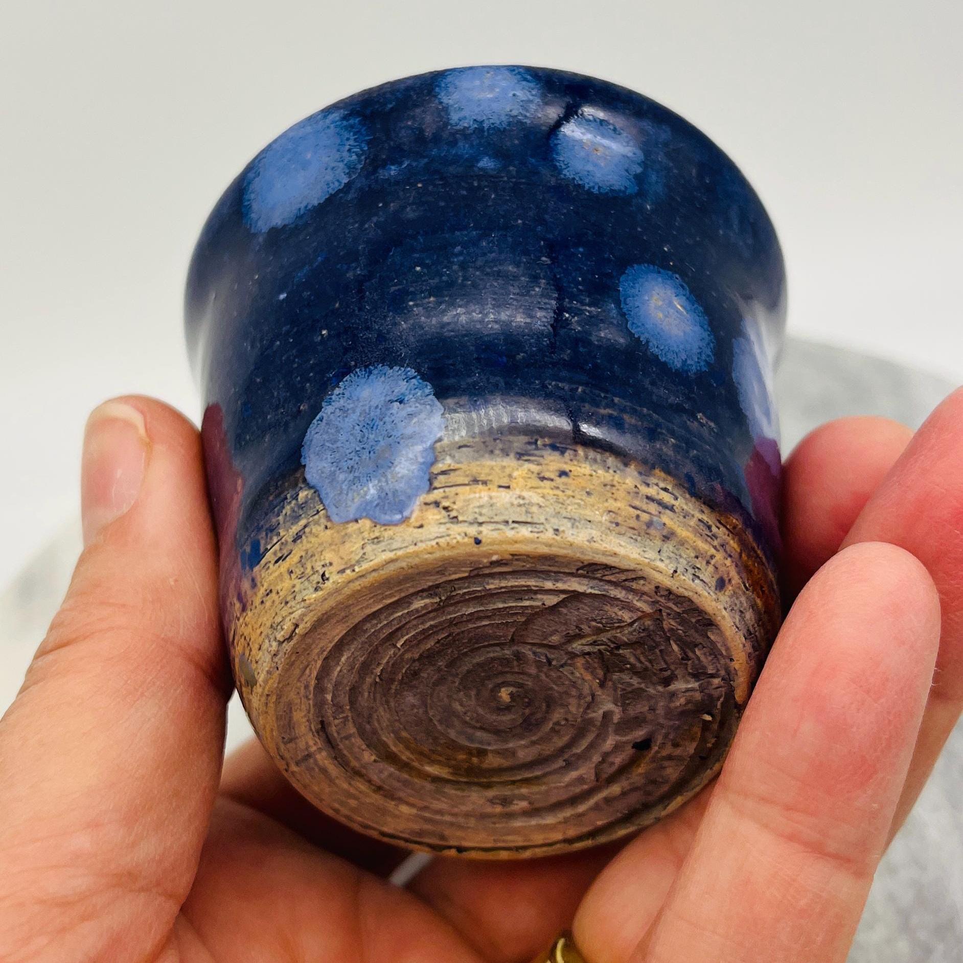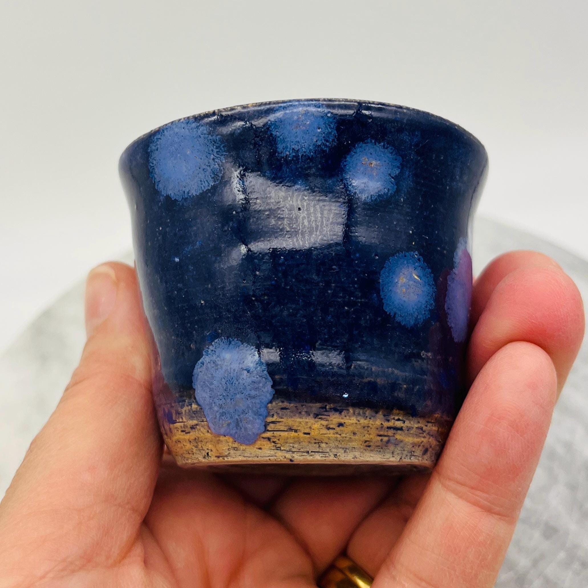 This lovely handmade pottery pot has a dark blue glaze with crystalline glass pieces in it. When it is fired in my kiln they melt onto the surface leaving this lovely glaze.