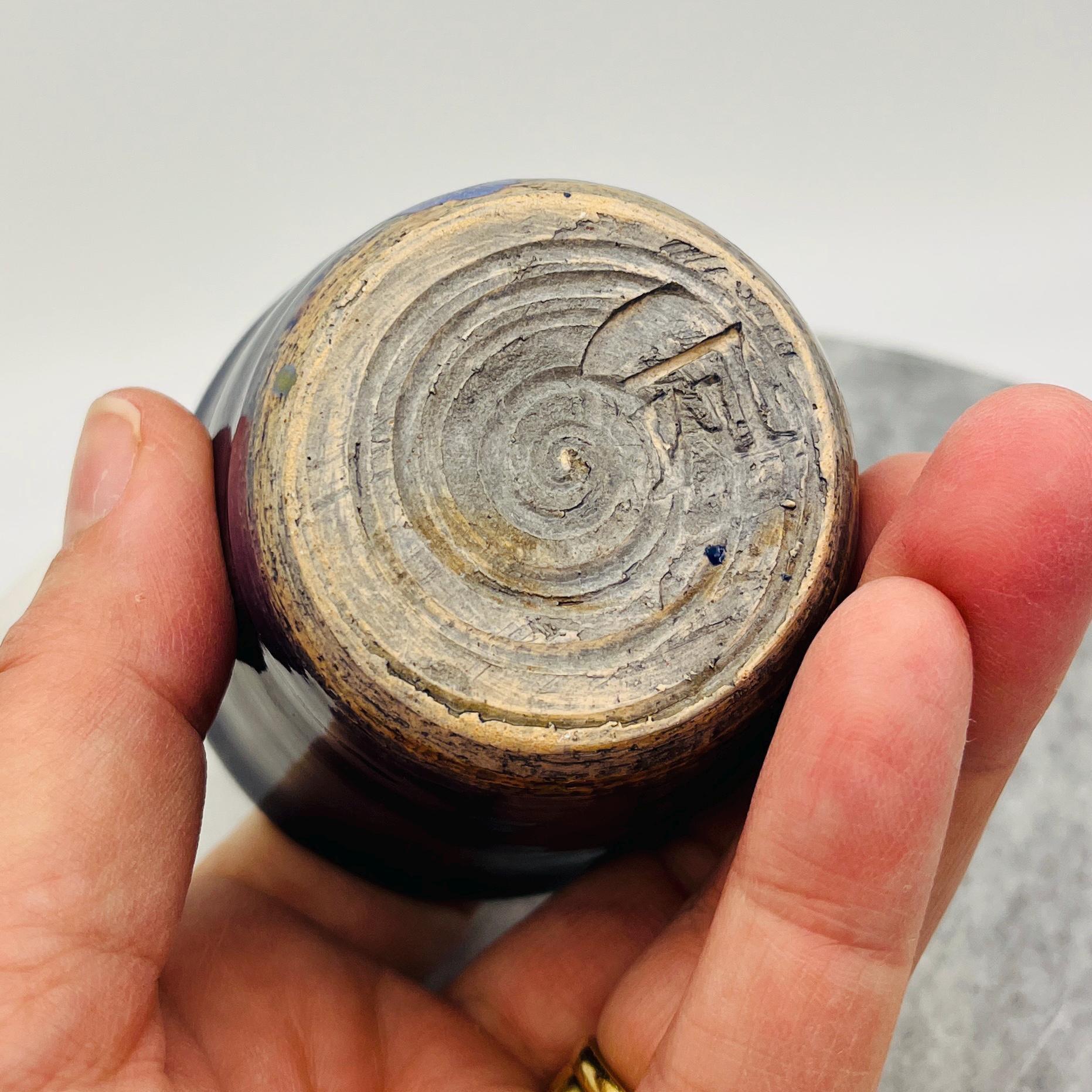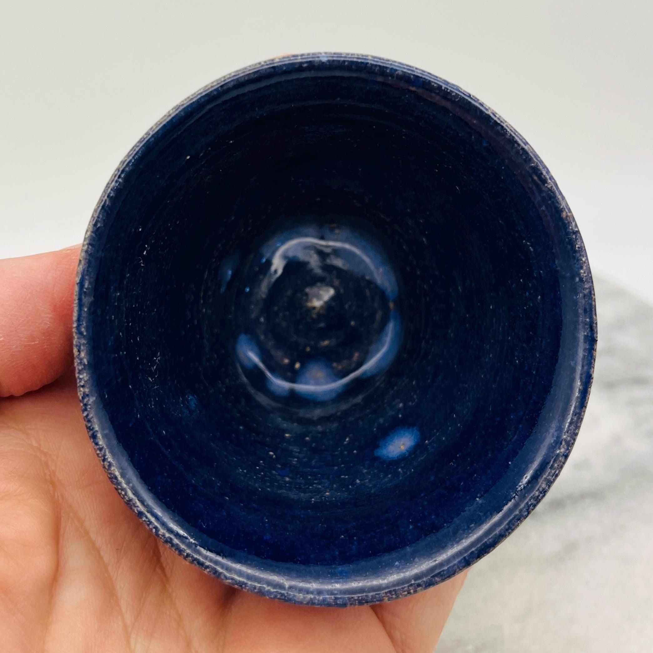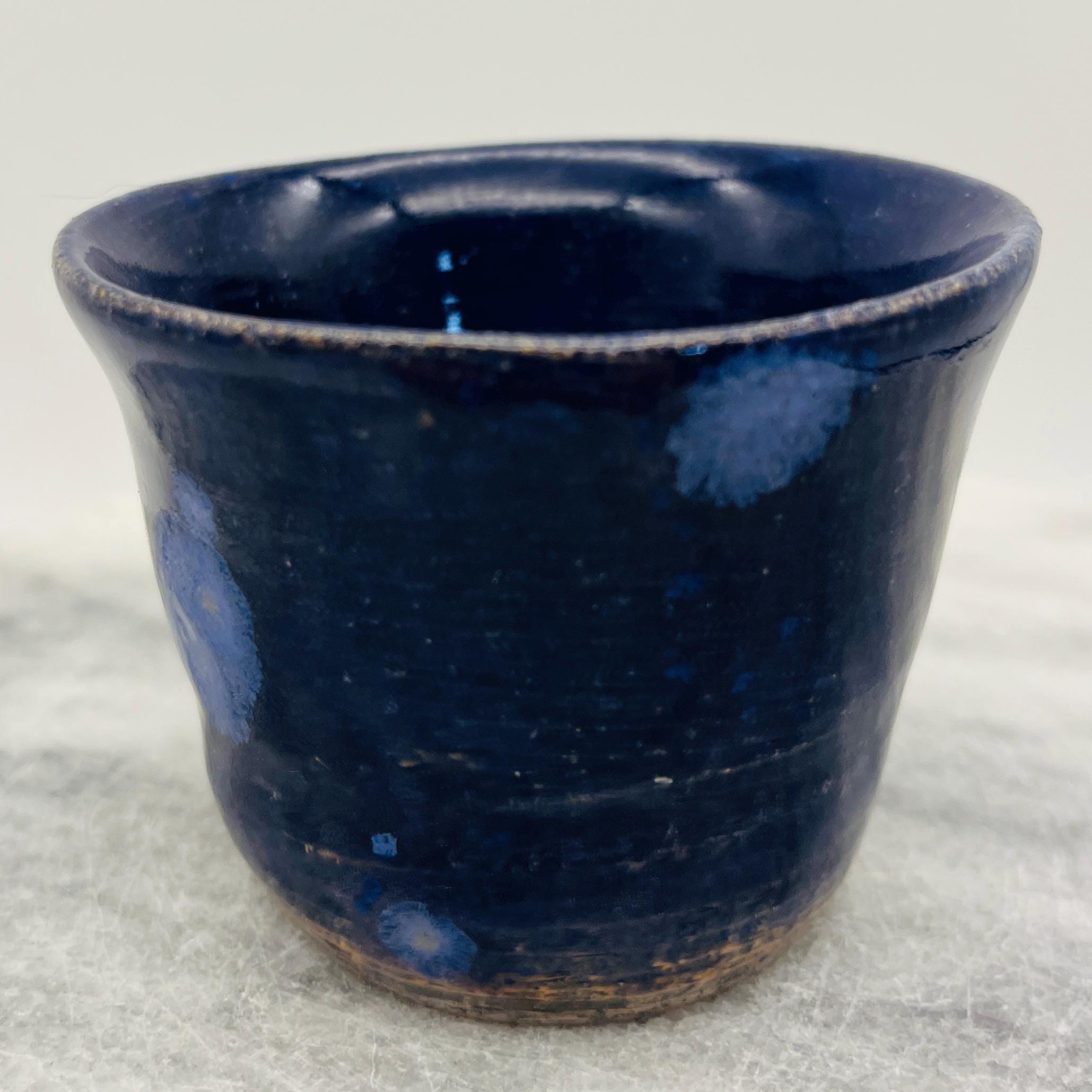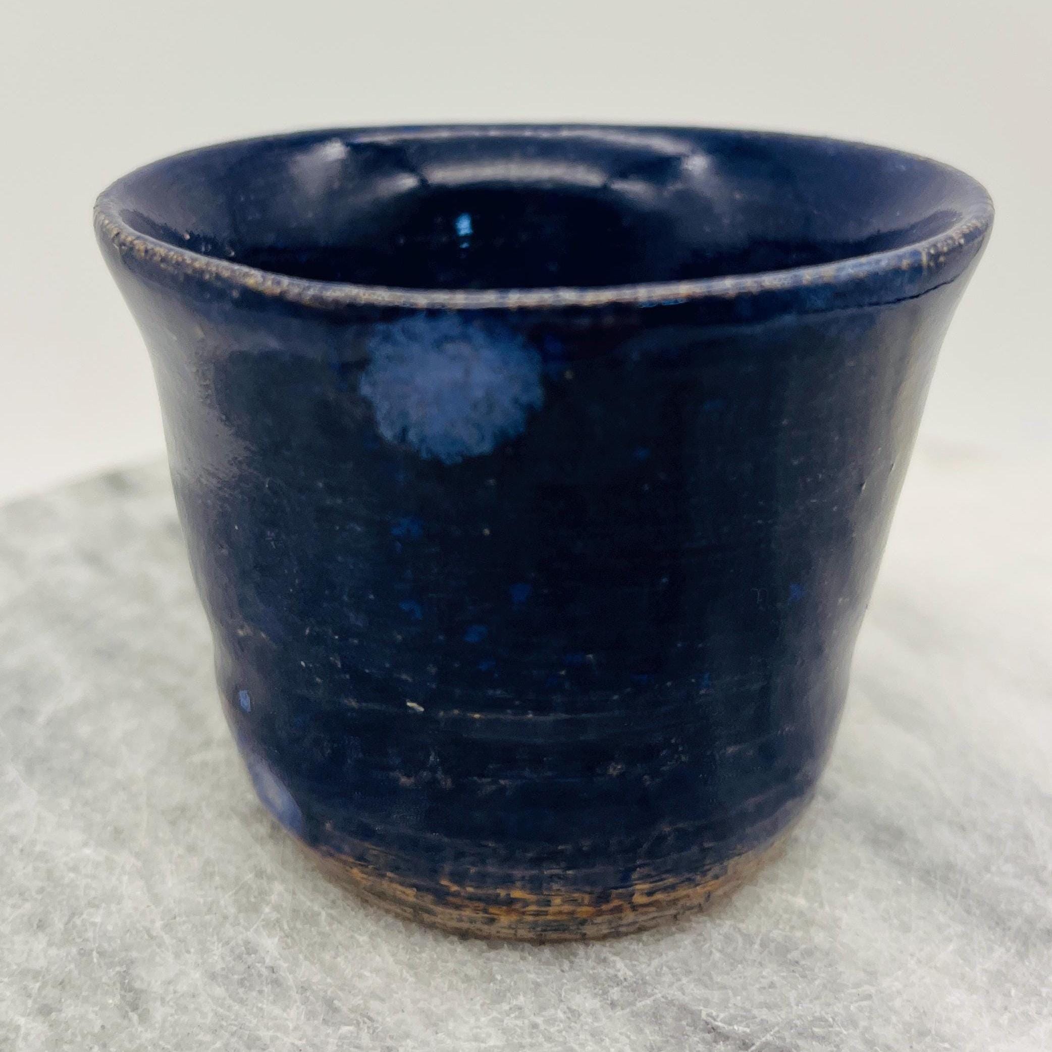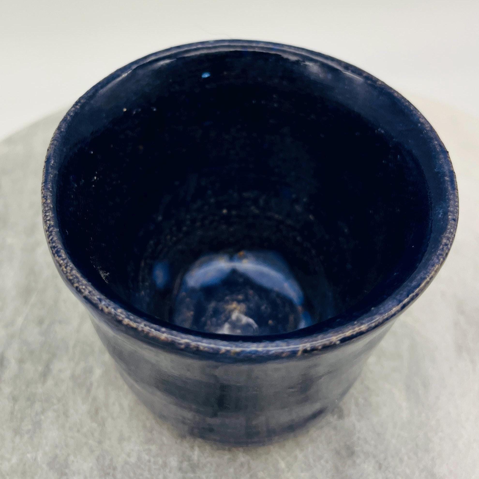 This lovely handmade pottery pot has a dark blue glaze with crystalline glass pieces in it. When it is fired in my kiln they melt onto the surface leaving this lovely glaze.