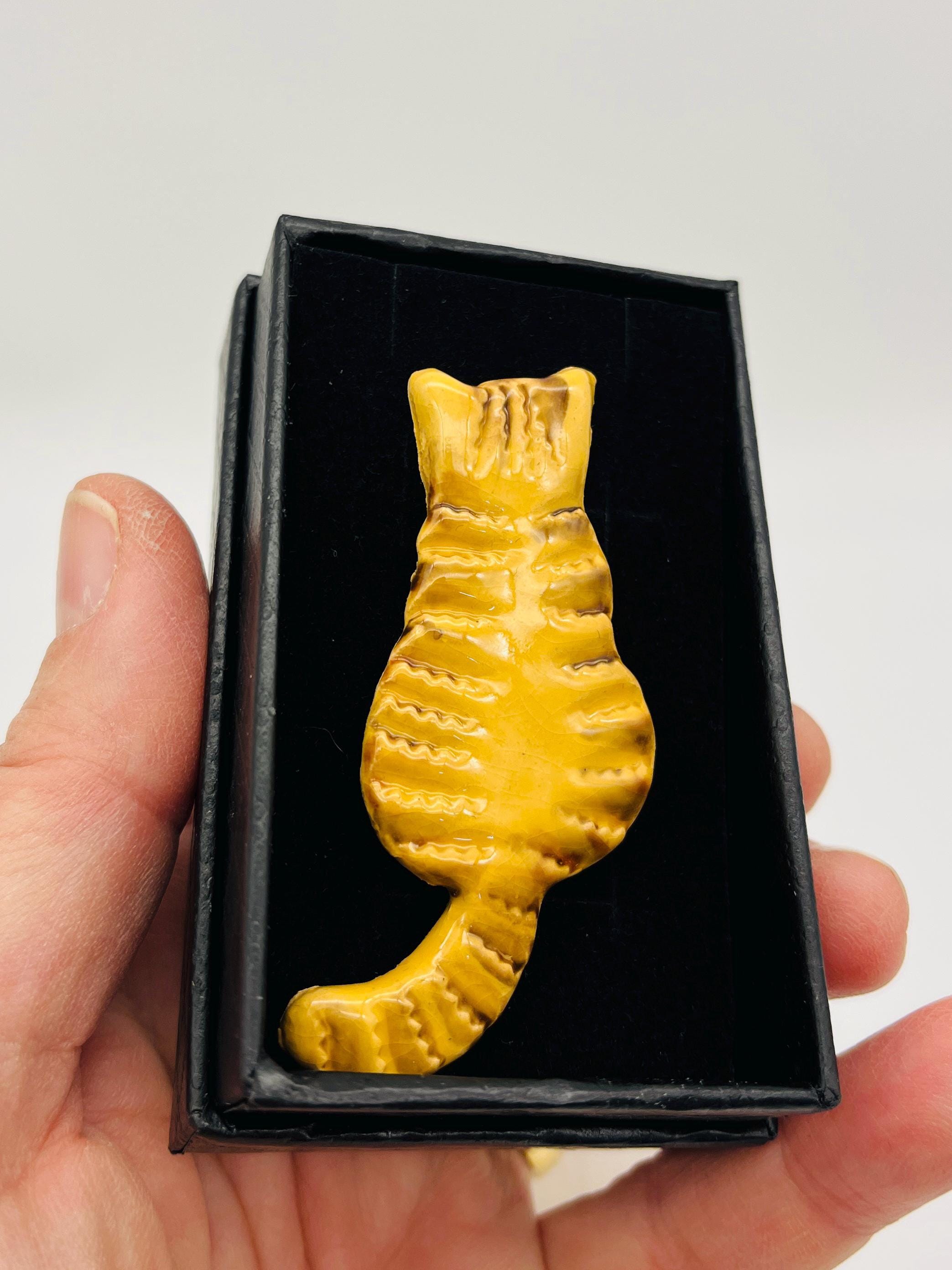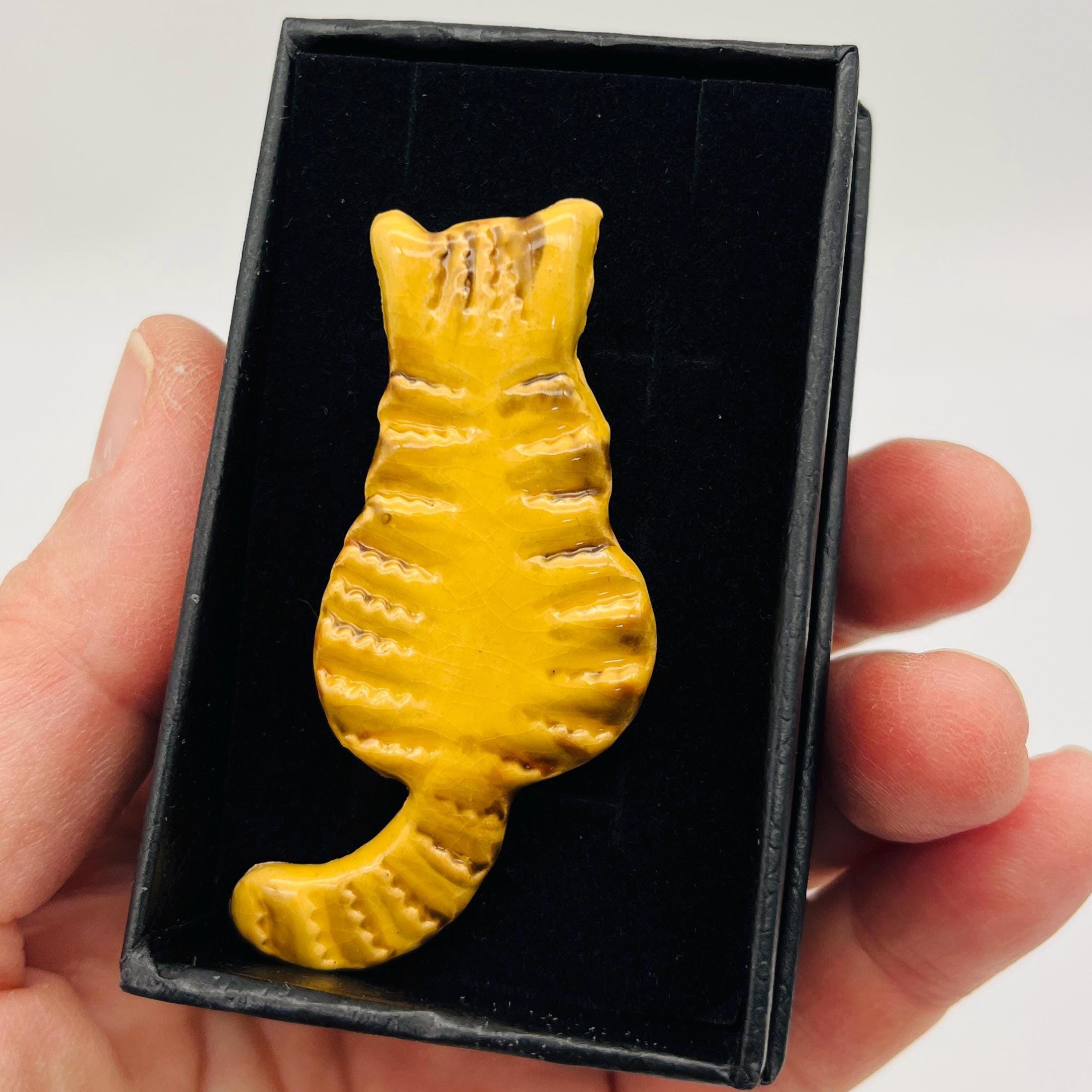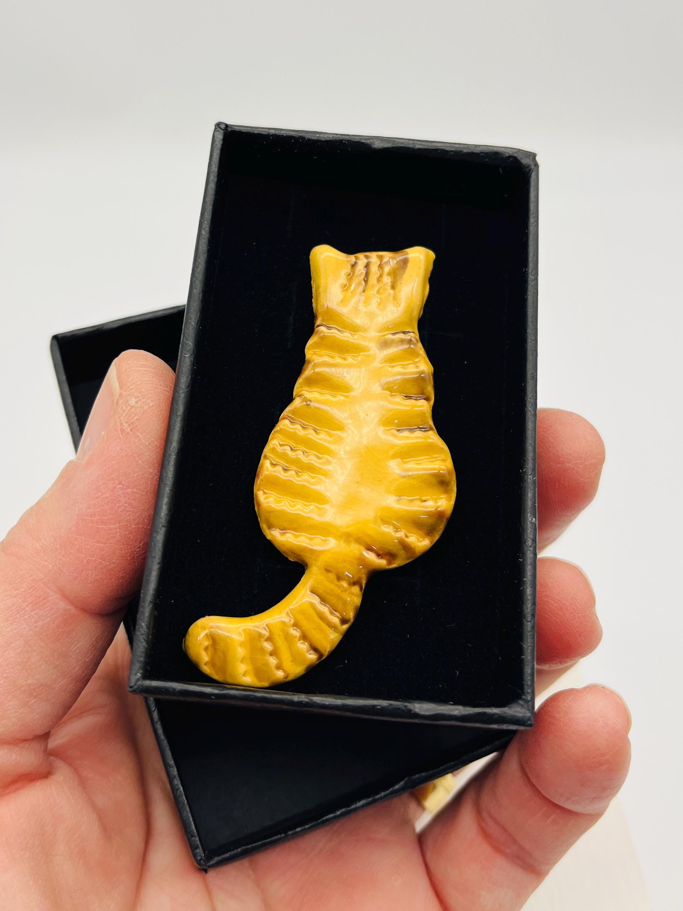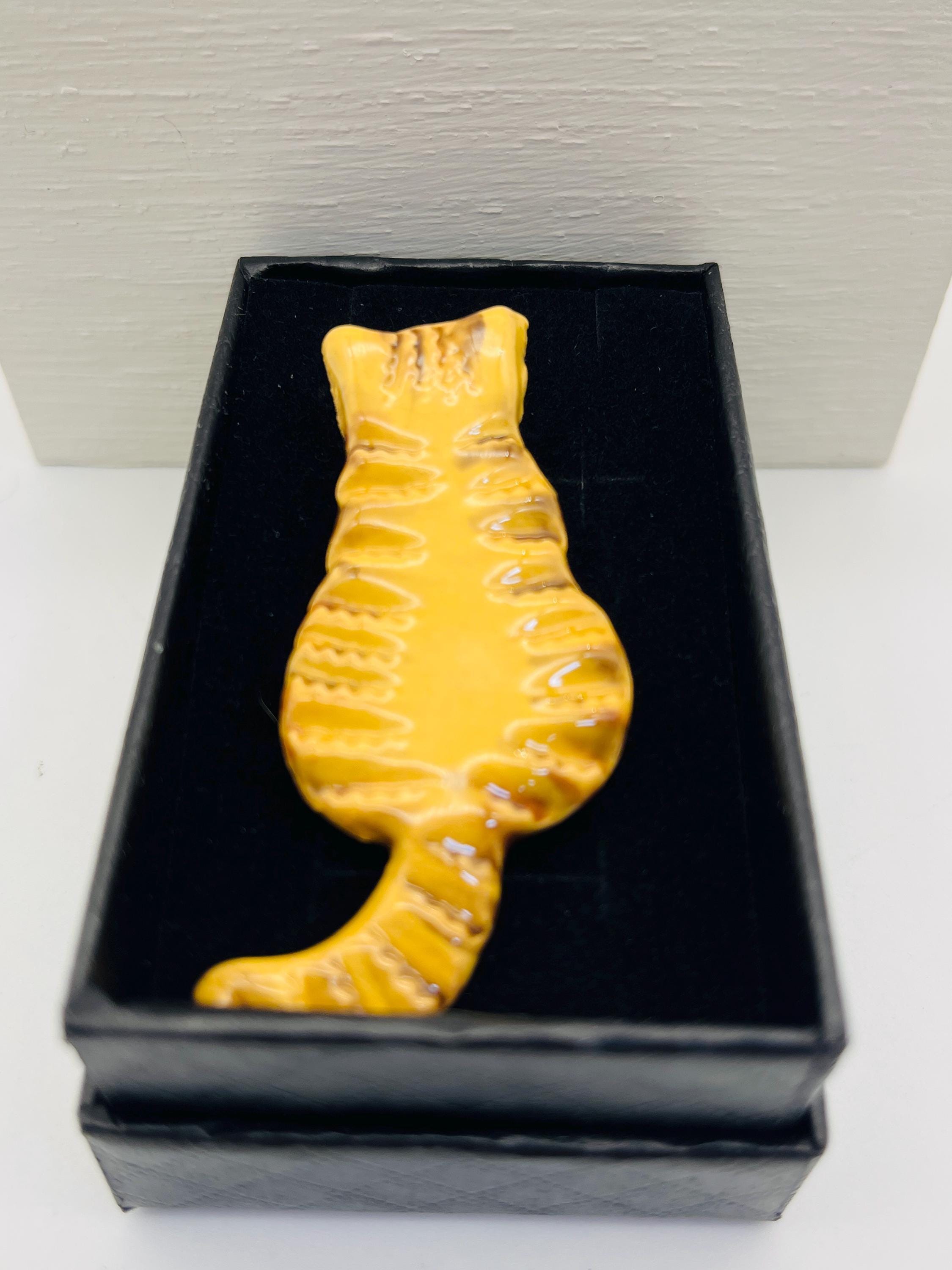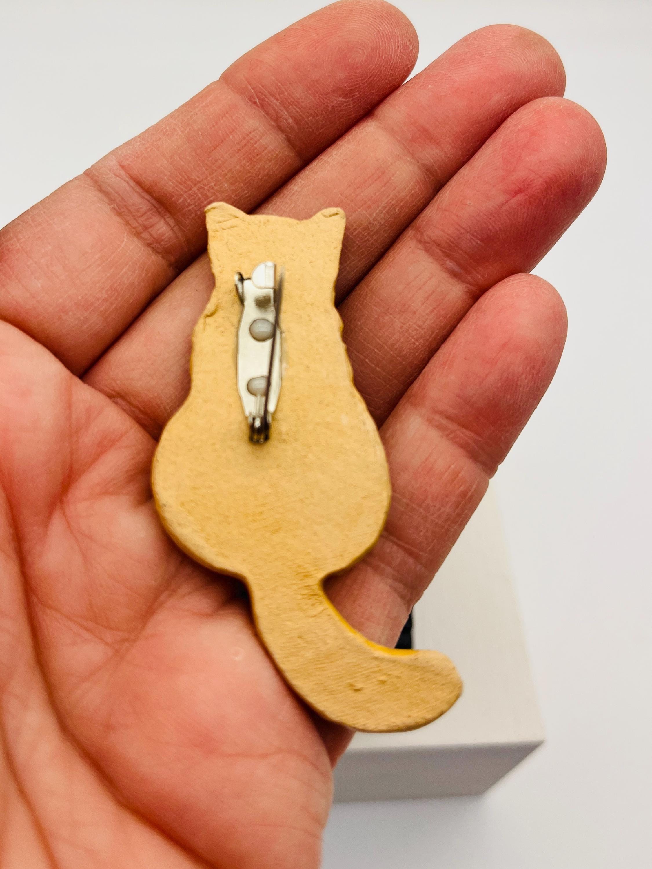 Handcrafted in my Sussex pottery called Woofing Fabulous. These cat brooches are great because they are all made individually with clay and come in their own little boxes and are great to give as gifts.