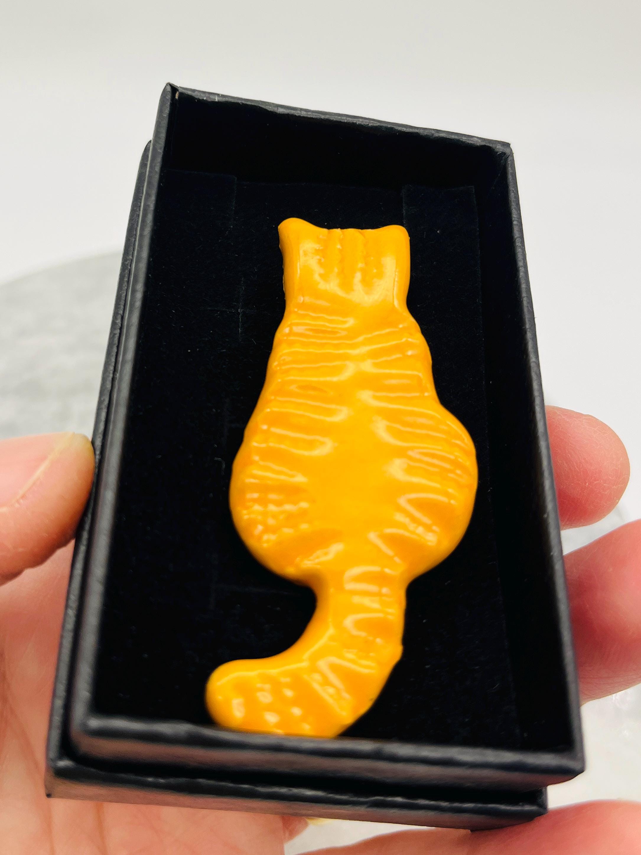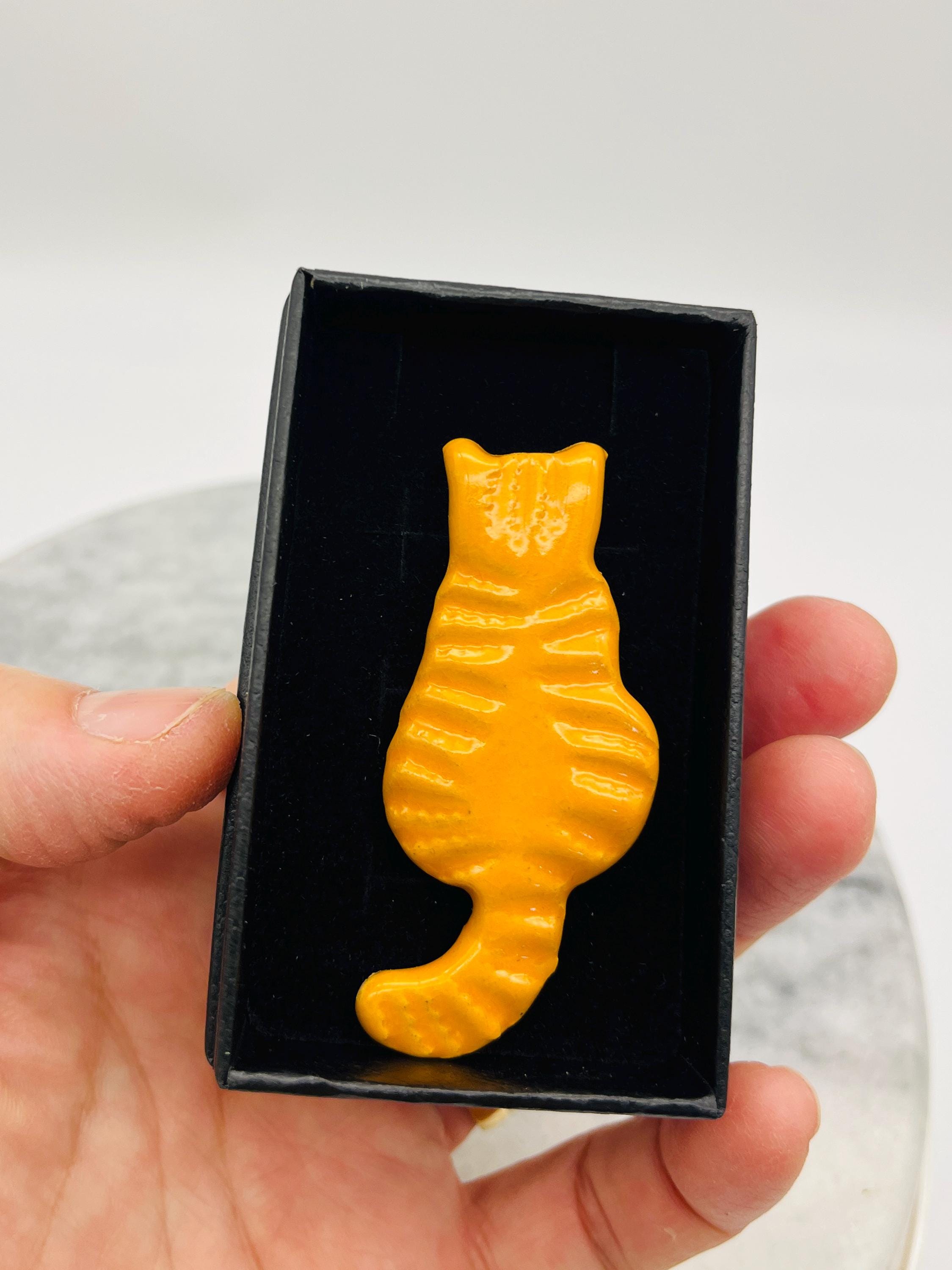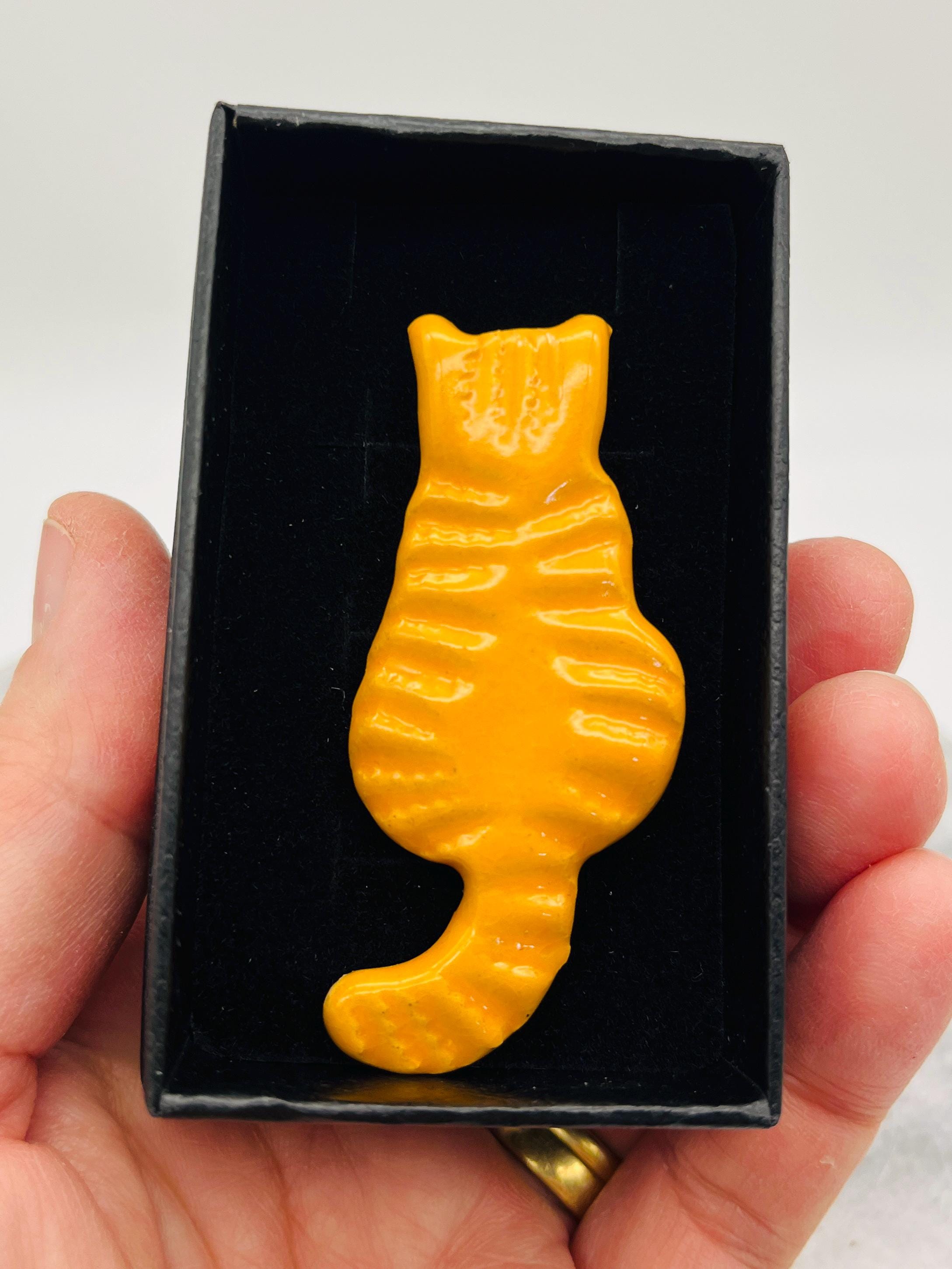 Handcrafted in my Sussex pottery called Woofing Fabulous. These ginger cat brooches are great because they are all made individually with clay and come in their own little boxes and are great to give as gifts.