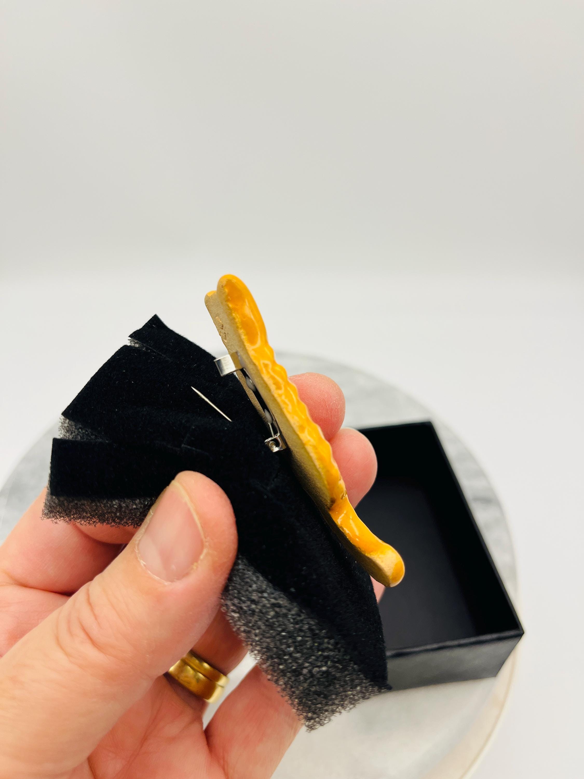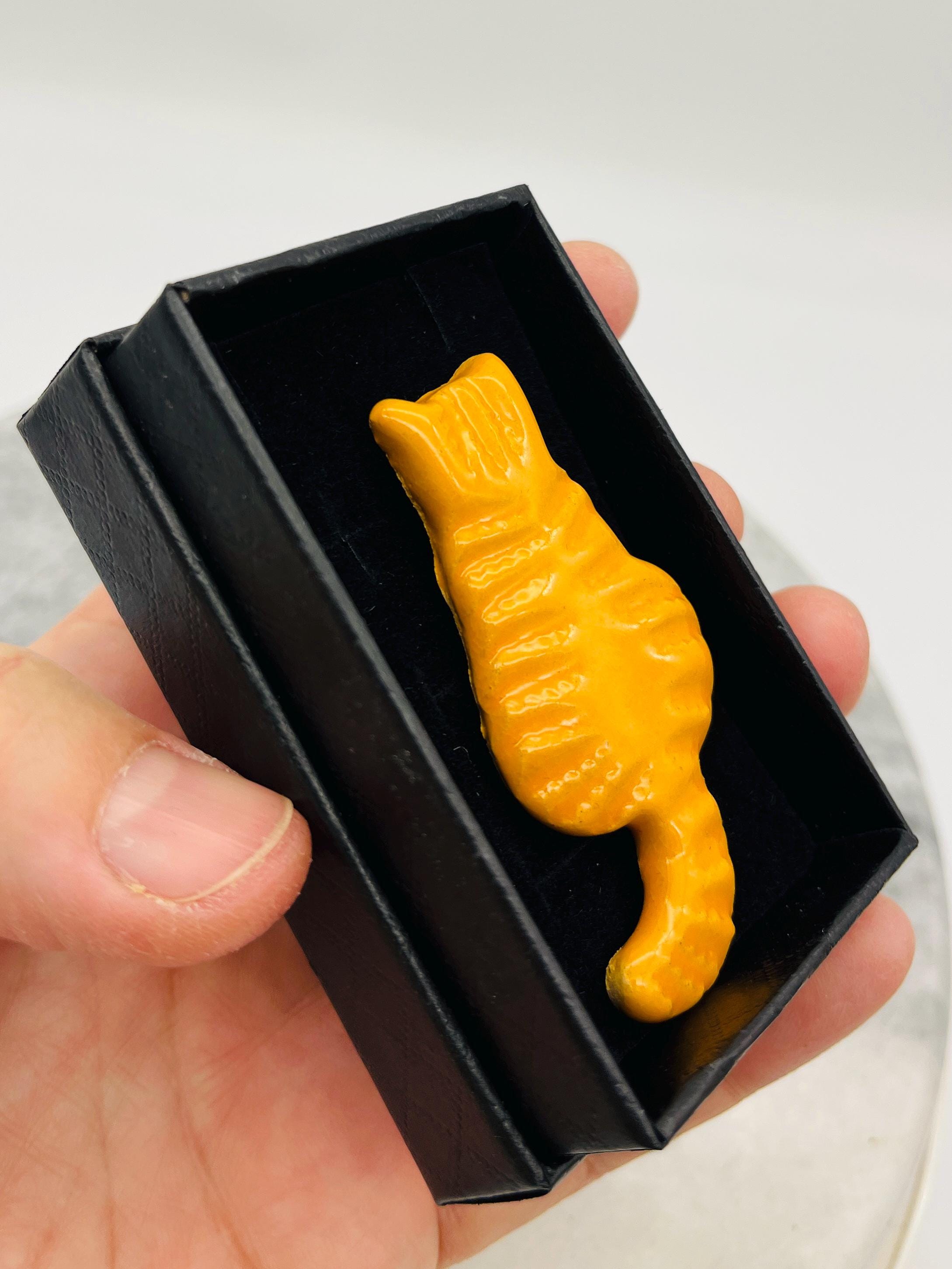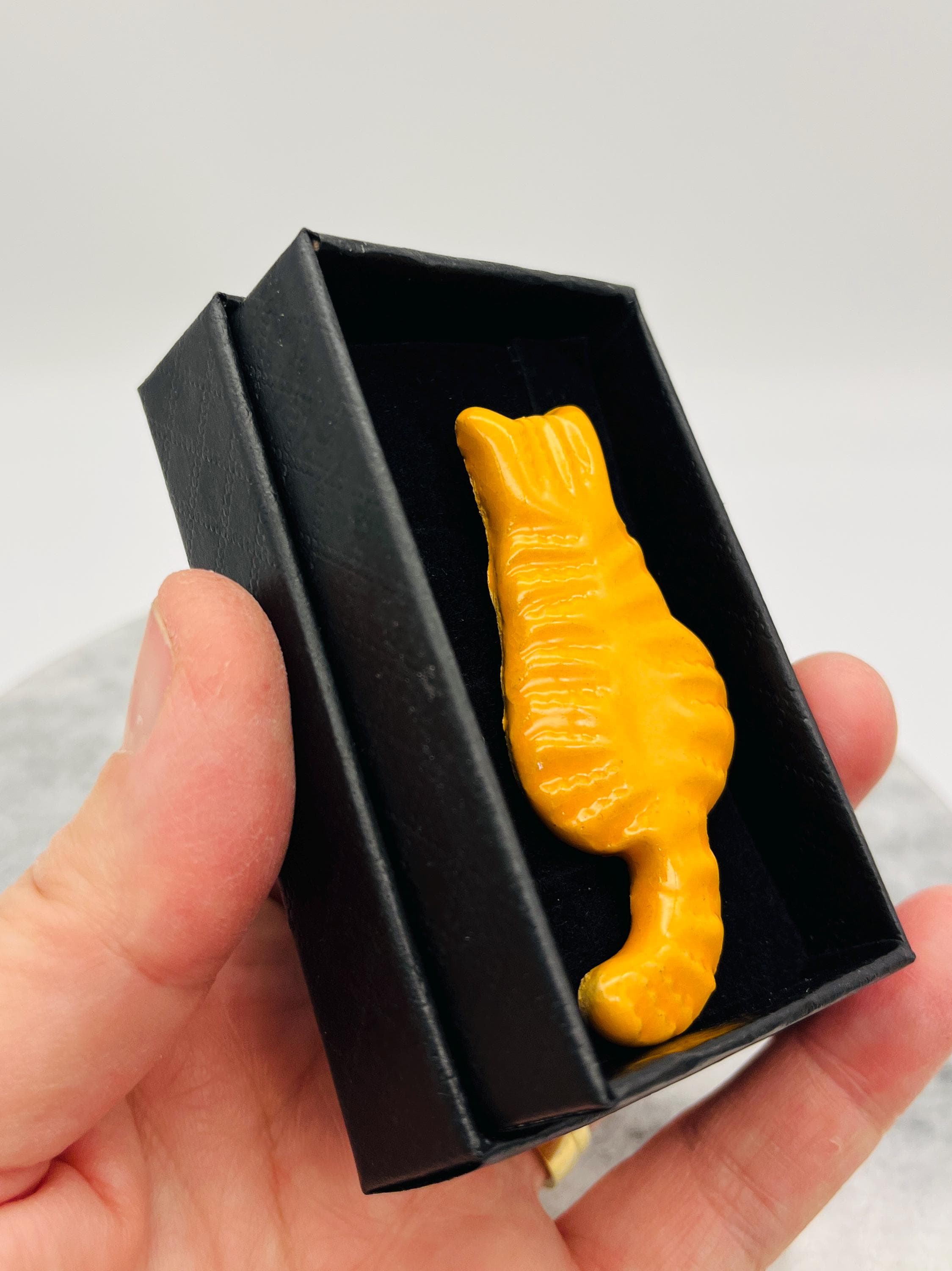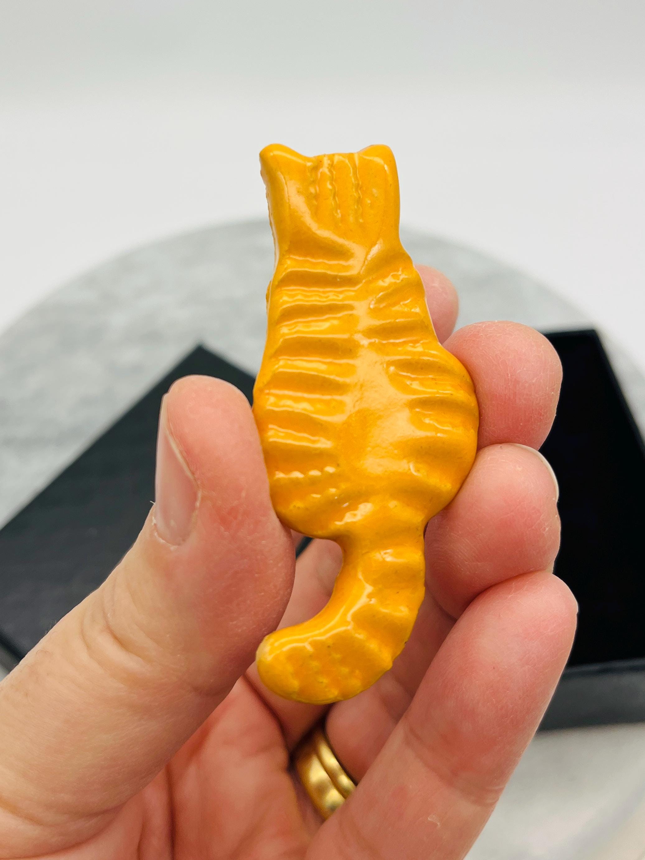 Handcrafted in my Sussex pottery called Woofing Fabulous. These ginger cat brooches are great because they are all made individually with clay and come in their own little boxes and are great to give as gifts.