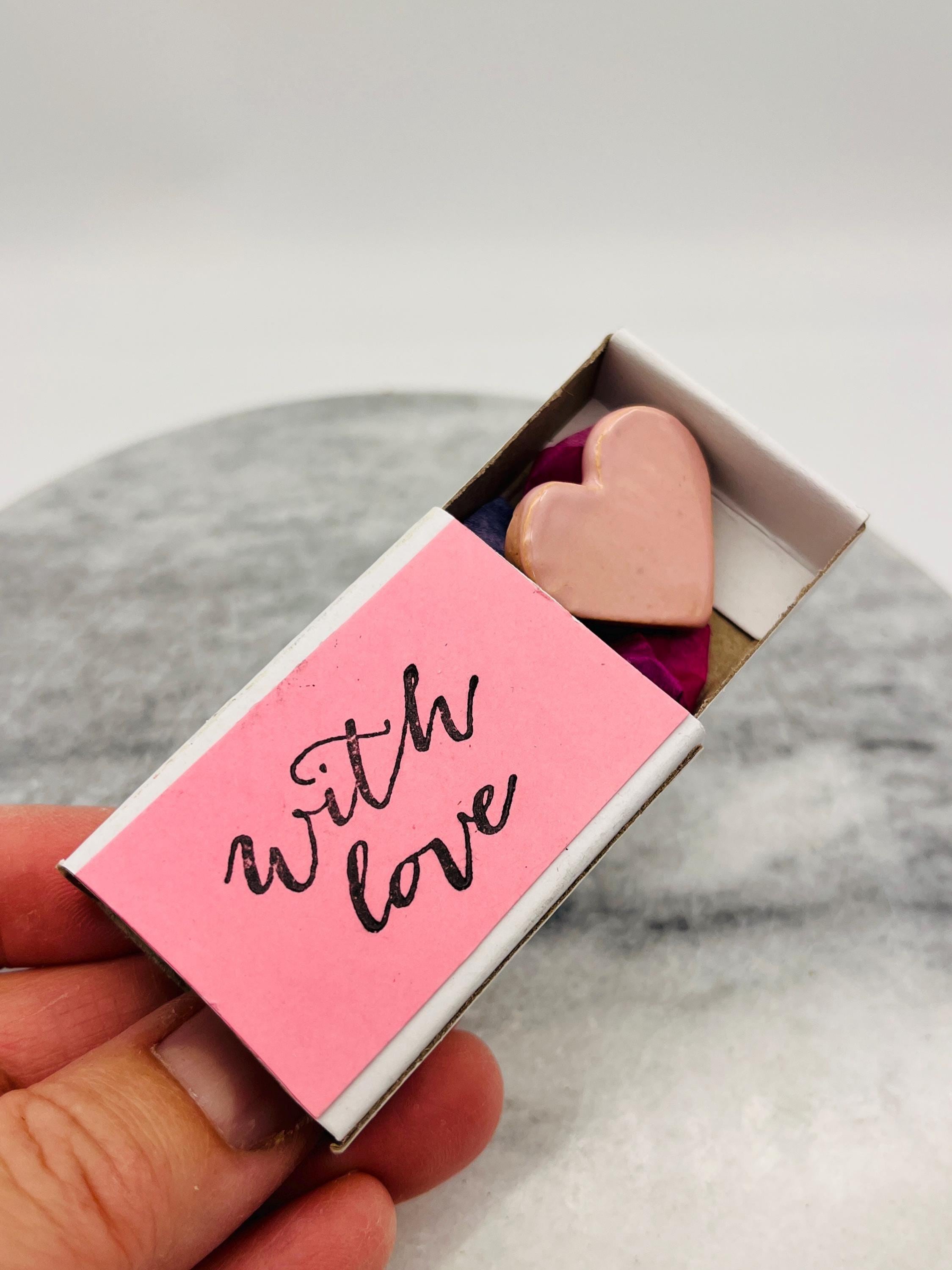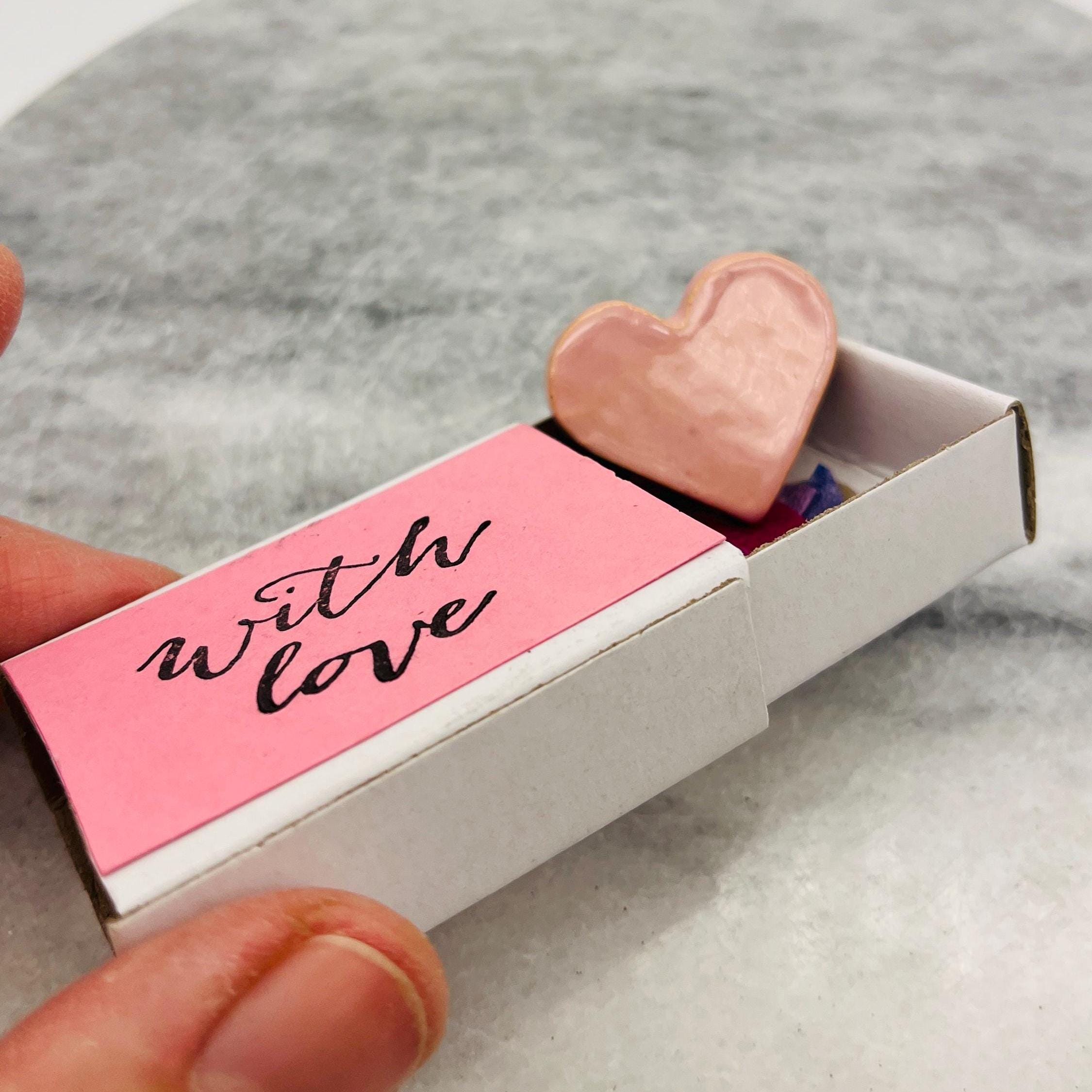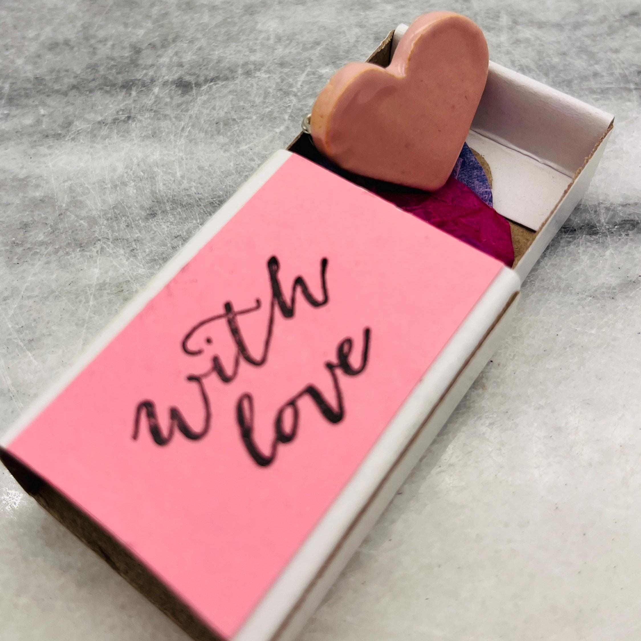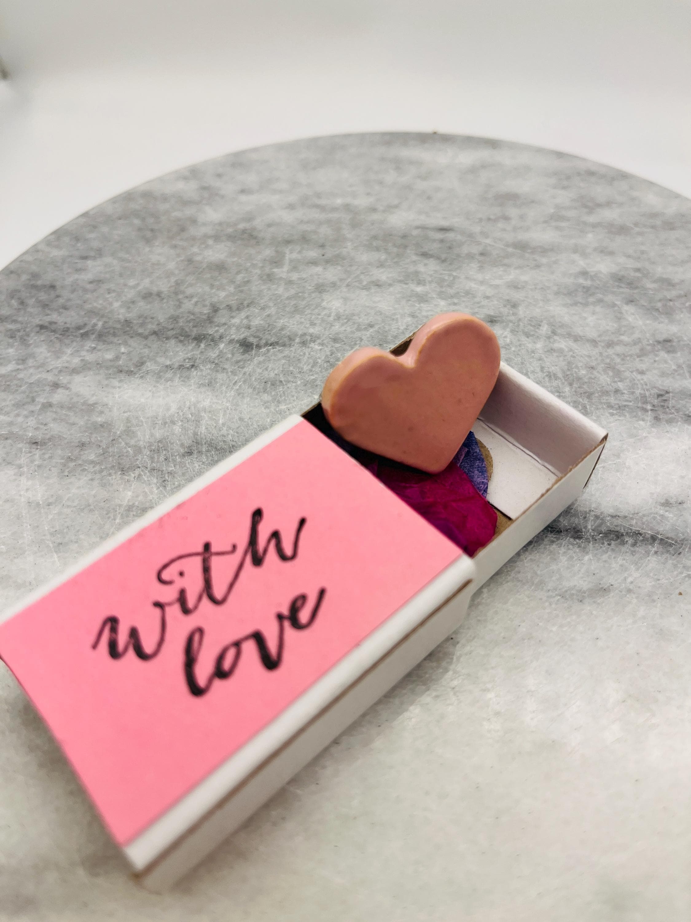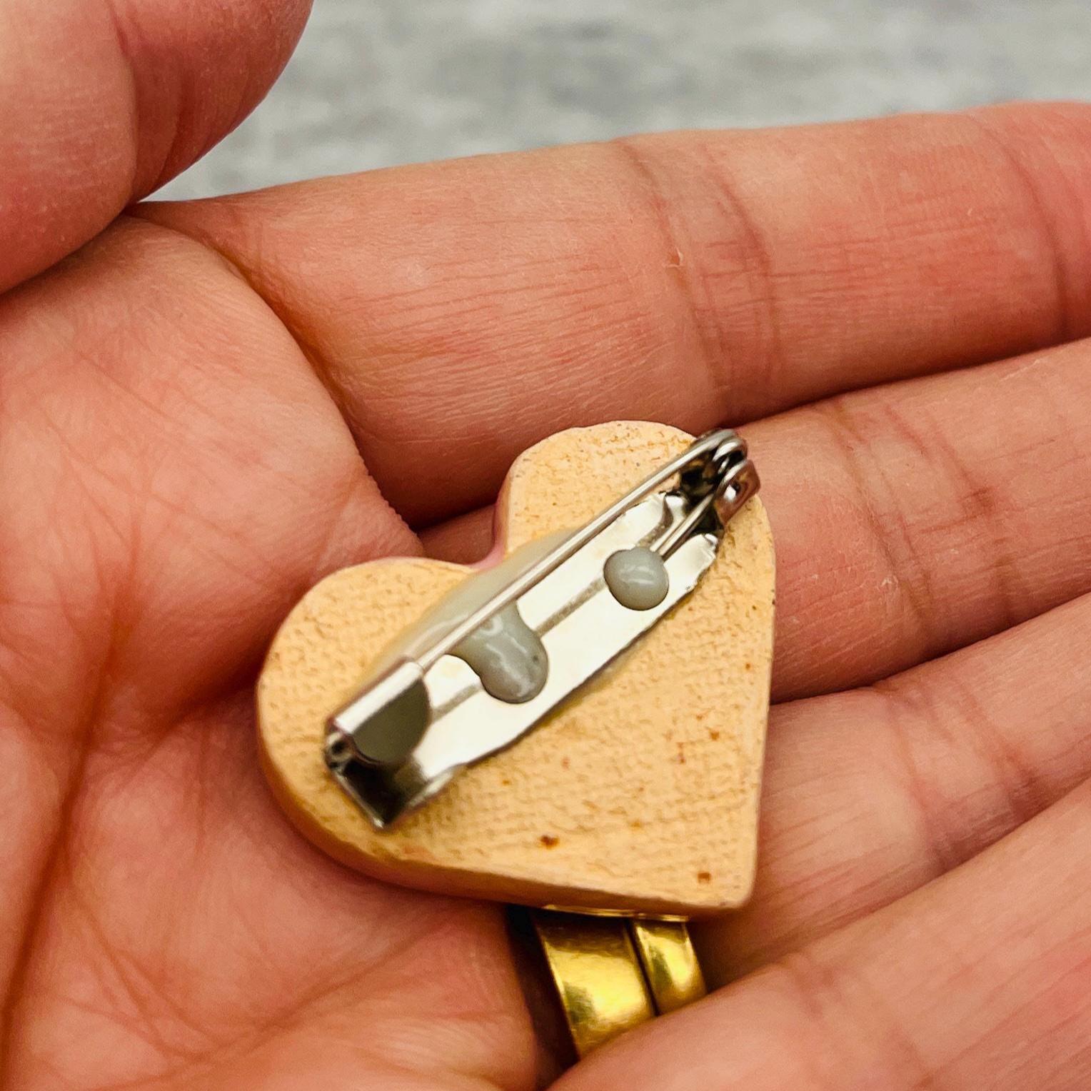 Handcrafted in my Sussex pottery called Woofing Fabulous. These heart brooches are great because they are all made individually with clay and come in their own little boxes and are great to give as gifts.