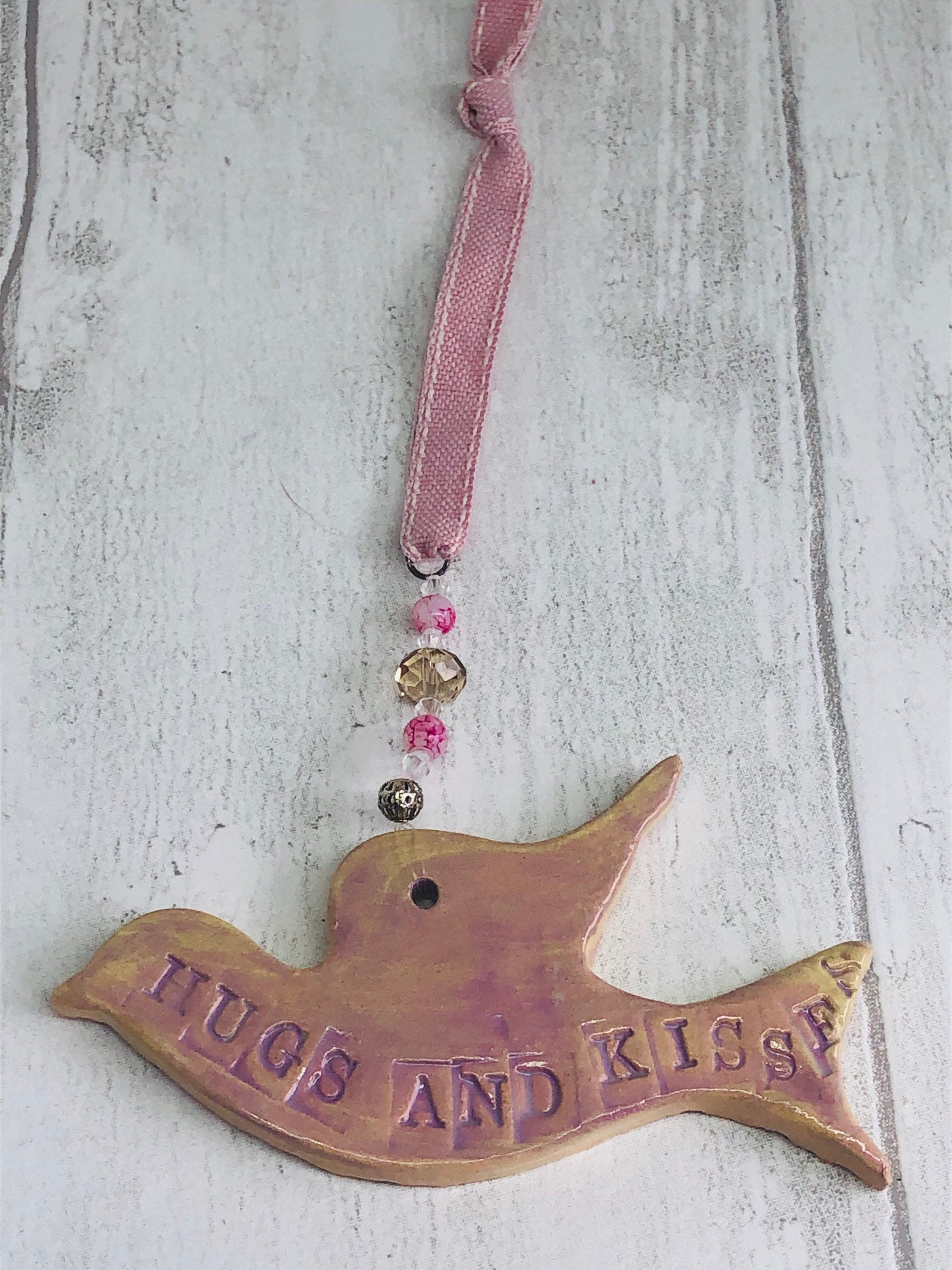 Hugs & Kisses Ceramic Bird Ornament, Handmade Pottery Ornaments, Home Decoration, Home Interiors, Love Quotes, Sayings. Kiln Fired Clay, UK.